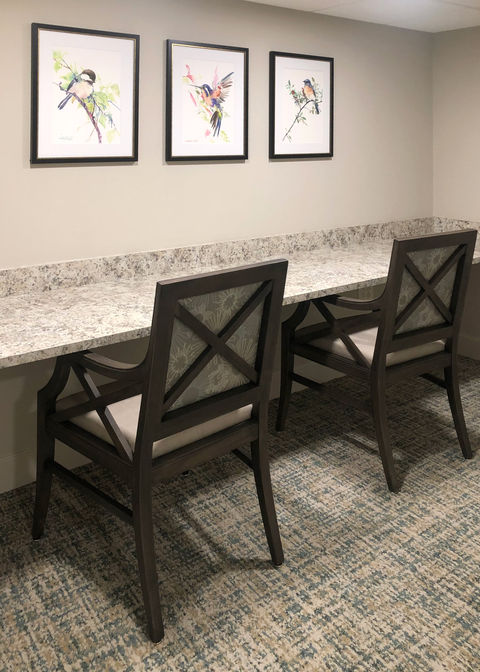 Design Solution: Working one-on-one with residents, needs and wants were incorporated into the design process. The new lobby features beautifully upholstered soft seating and original art pieces from local artists. Several additional seating groups ensure that the vast space feels cozy and scaled down. A large concrete platform was removed from existing main dining room to create functional pathways and plenty of seating to accommodate residents. Various styles of seating groups were incorporated to break up the large, open dining space and to create more intimate dining areas. The warm color schemes and playful mix of patterns brighten the space and refresh many of the spaces residents use and enjoy every day.