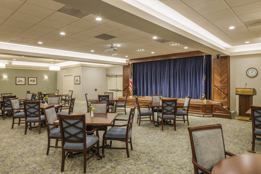Brief: To update the main dining room in a senior living community, to incorporate a new cocktail bar, a revitalized multi-purpose stage, and a completely redesigned main dining room for the residents.