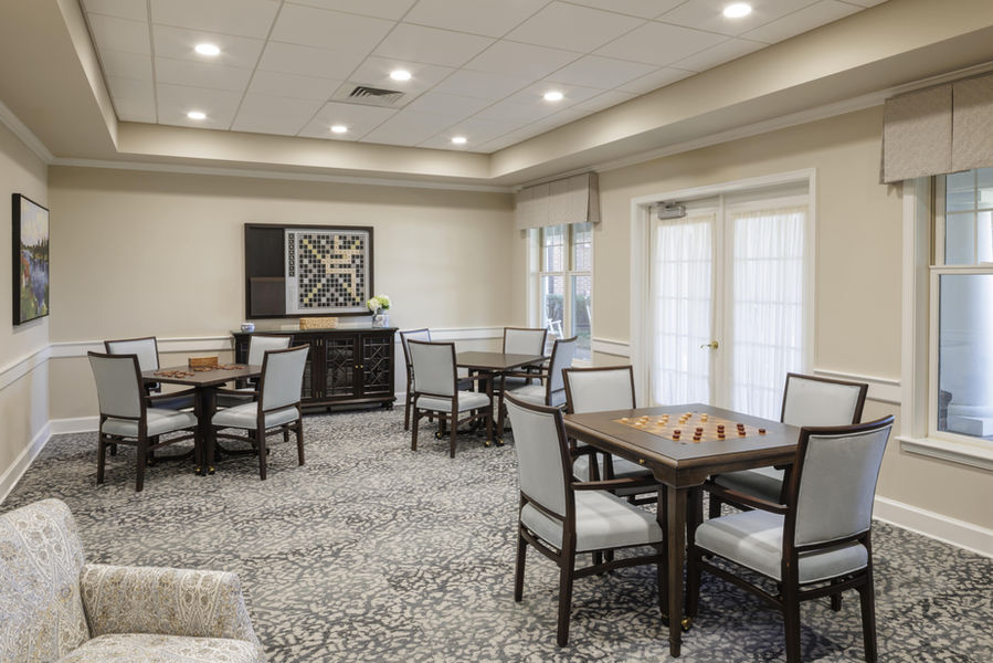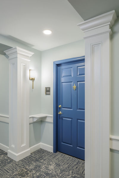 Design Solution: The first phase of this multi-phase renovation transformed the main lobby, reception area, and corridors into a welcoming and sophisticated space. A calming palette of light blue, navy, and grey enhances the refreshed design, while a curved stained-wood reception desk serves as a warm focal point. Updated furnishings and finishes improve both aesthetics and comfort, creating a more inviting atmosphere. The revitalized corridors provide a seamless flow throughout the facility, tying the spaces together. With this phase complete, additional enhancements are underway to further elevate the community.
